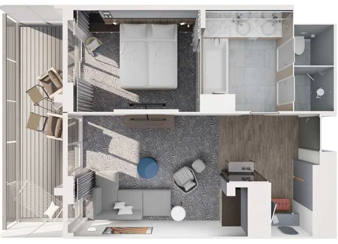 | JBCO - Junior Suite s balkónom C 26 m² + balkón 7 m² so stoličkami a podnožkami. 7. paluba. Max 4 osoby. Výhody Junior Suite. | 13 496 € 3 374 € za osobu |
